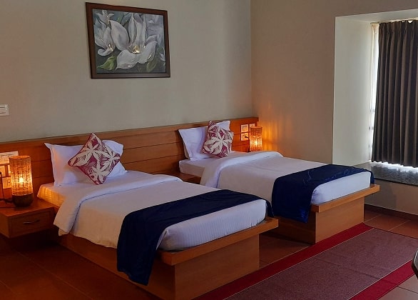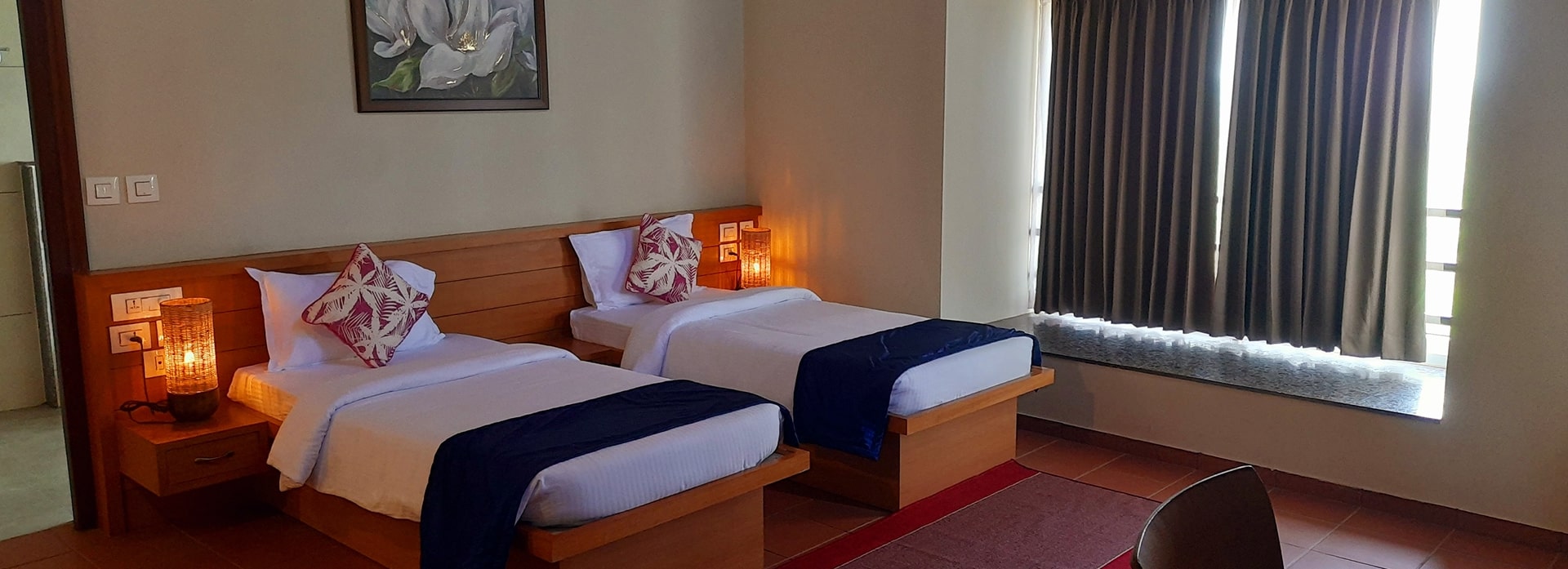The Junior Suites (600 sq. ft.) are designed to provide a luxurious and relaxing experience and offer a spectacular view of the surrounding greenery. The twin-bedroom suites also include a living room and offer all modern comforts including air conditioning, complimentary internet access, television, mini-bar, in-room safe, wardrobe, bathrobe, bath slippers and more.
